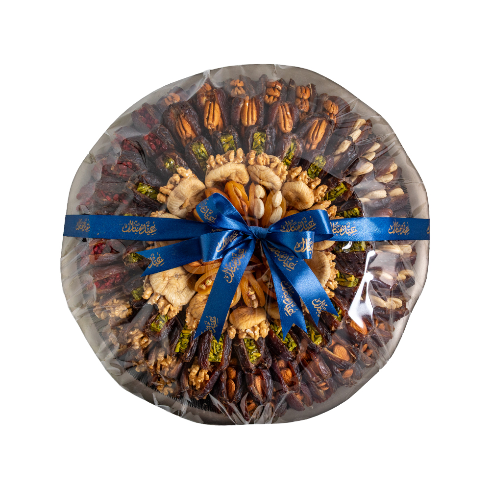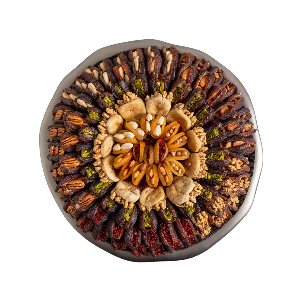 Designed as a grand Eid centerpiece, this Antique Brass tray combines jumbo stuffed dates with almond, cashew, pecan, walnut, pistachio and pomegranate fillings alongside stuffed figs and apricots. A distinguished festive selection for generous hospitality and premium gifting.