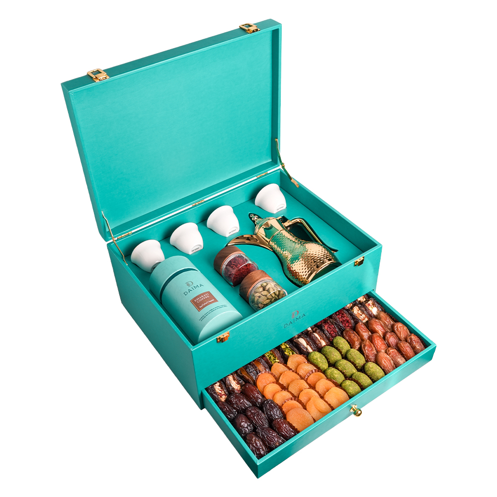 Daima Dallah 5 Coffee and Dates Luxury Gift 8 Set is a refined hospitality collection designed to reflect tradition, generosity, and premium quality. This elegant set brings together carefully selected dates, gourmet stuffed varieties, dried fruits, aromatic spices, and authentic Arabic coffee essentials in one complete gifting experience.