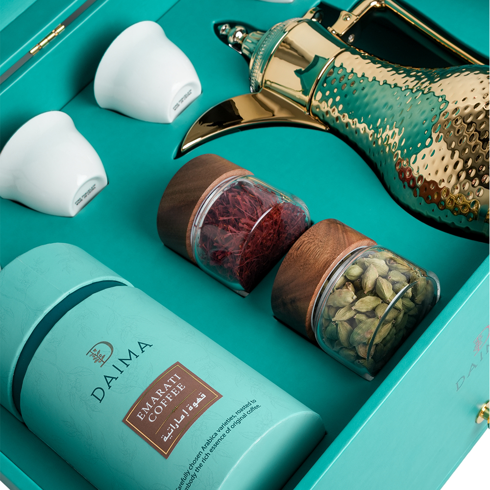 At the heart of the set is the Arabic Coffee Dallah CRG5 along with Emirati hand roasted coffee 250gm, creating a complete coffee and dates serving experience. Ideal for Ramadan gatherings, Eid gifting, corporate presents, and luxury hospitality, this set embodies Daima’s commitment to quality and cultural elegance.