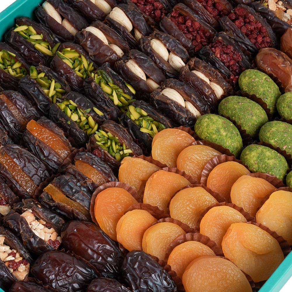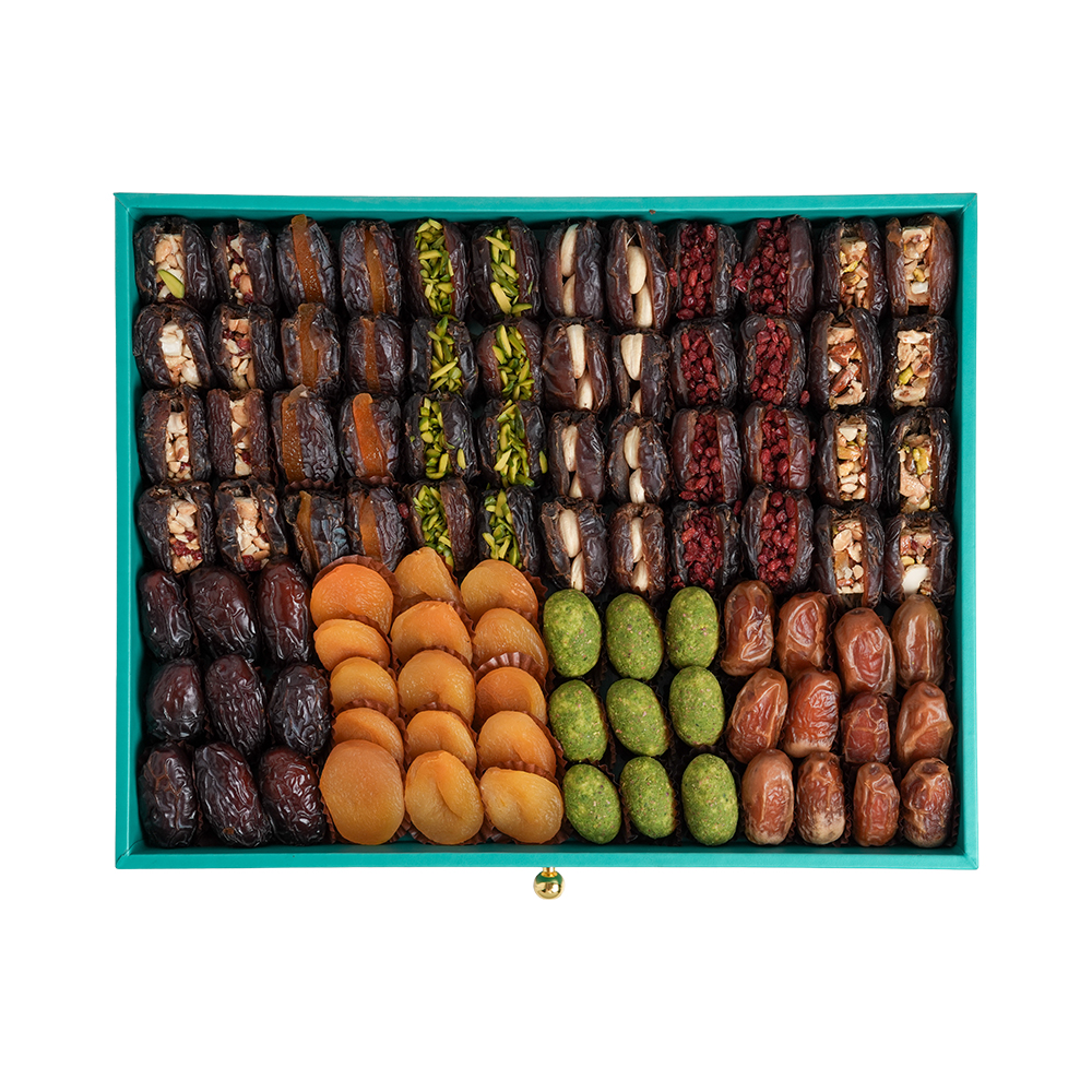 The set includes premium Saffron Super Negin 5gm, Majdool Super Jumbo dates, Sagee dates, assorted jumbo stuffed dates, and jumbo dried apricots. It is complemented with stuffed dates pomegranate and mixed bars, dates chocolate with tahina and rahesh, and roasted green cardamom for a rich traditional flavor profile.