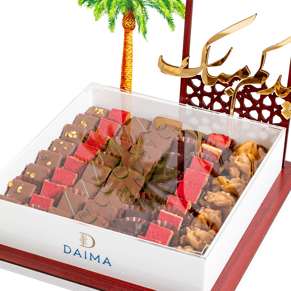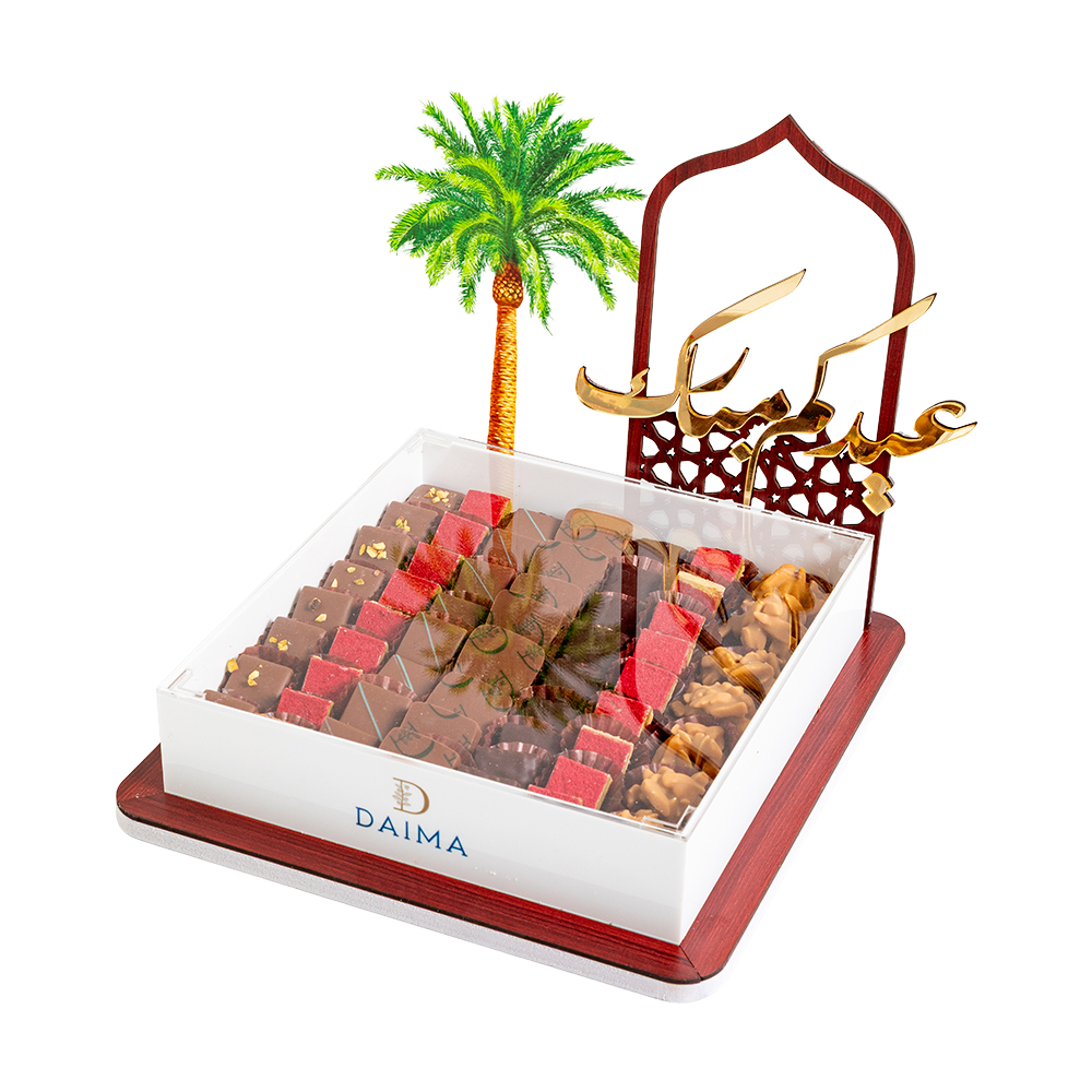 This 555g Eid Special praline chocolate tray blends muhallabia ganache, roasted almond dark chocolate, pistachio praline and passionfruit mango caramel selections. Crafted to elevate festive gatherings, it delivers vibrant flavors in an elegant presentation perfect for Eid gifting.