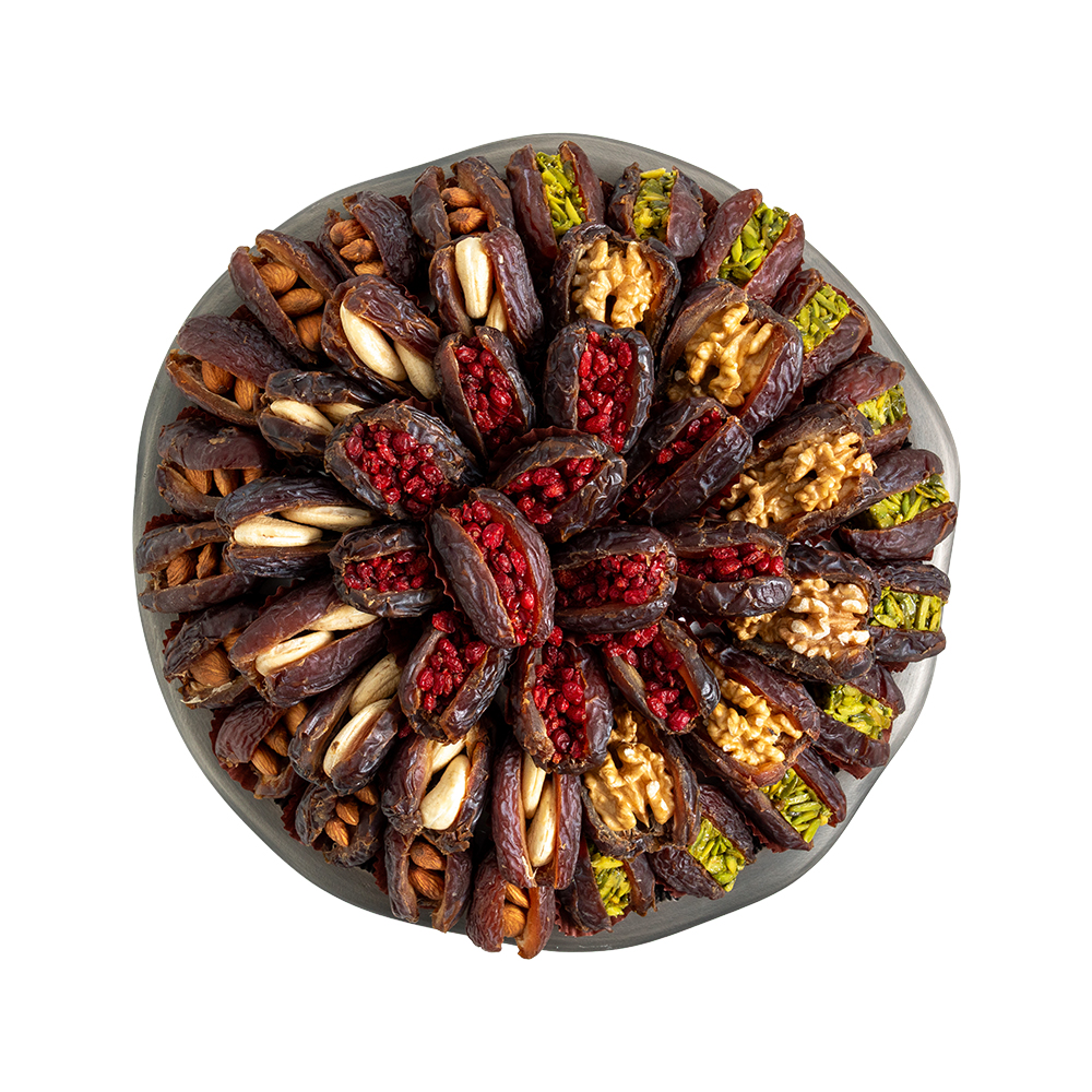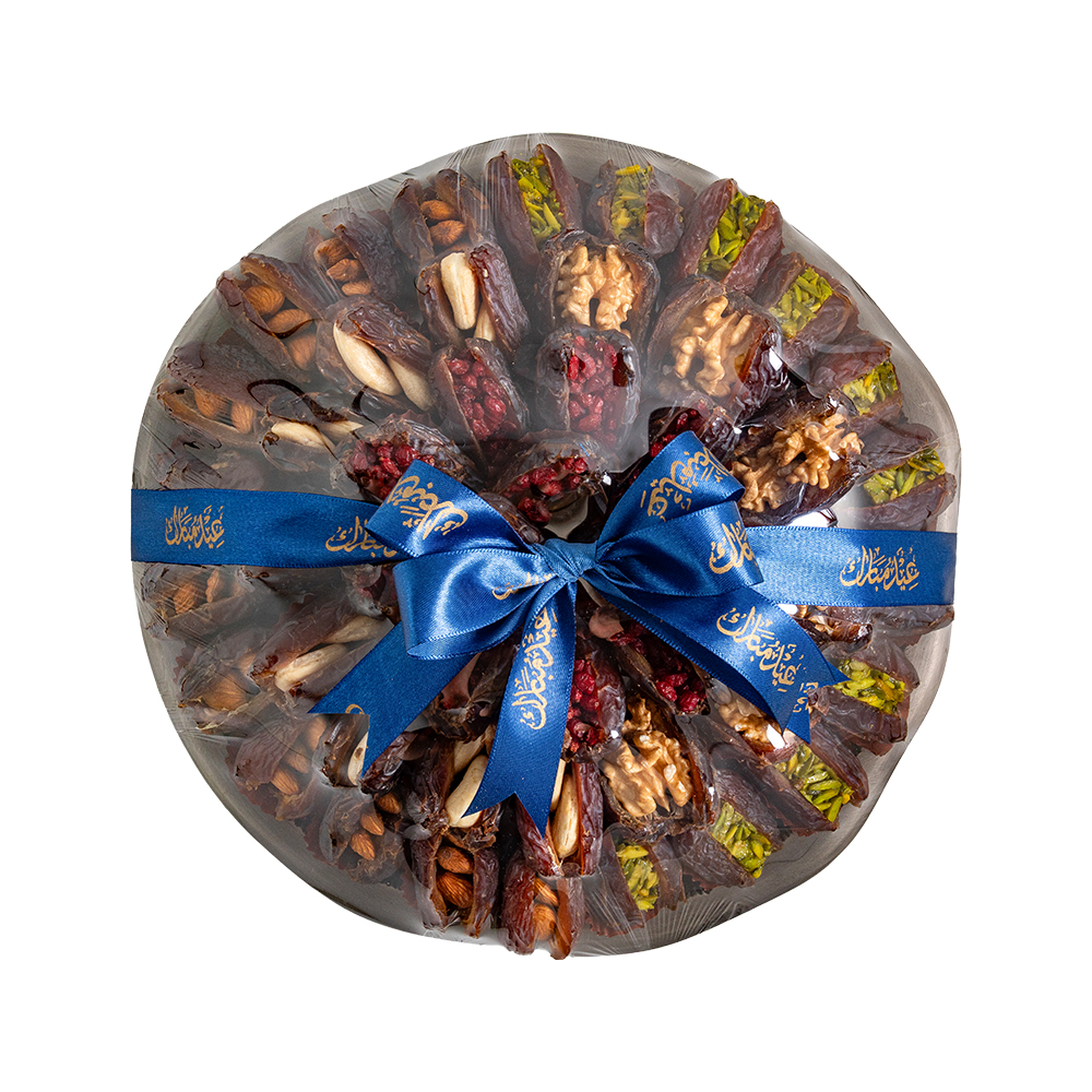 Crafted for refined Eid gatherings, this Obsidian Oak tray presents a premium assortment of jumbo stuffed dates filled with almond, cashew, walnut, pomegranate, and pistachio bar. Elegantly arranged, it reflects festive generosity and sophisticated hospitality traditions.