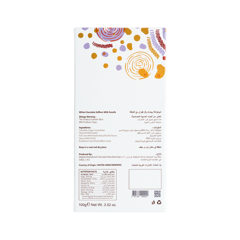 Product DescriptionIntroducing Daima White Chocolate Saffron With Kunafa, an exquisite creation that redefines dessert luxury. This handcrafted chocolate bar blends velvety white chocolate with the rich, aromatic essence of saffron, layered with golden kunafa flakes for a satisfying crunch. Each piece offers a symp...Reviews0 Back Introducing Daima White Chocolate Saffron With Kunafa, an exquisite creation that redefines dessert luxury. This handcrafted chocolate bar blends velvety white chocolate with the rich, aromatic essence of saffron, layered with golden kunafa flakes for a satisfying crunch. Each piece offers a symphony of flavors - from the smooth sweetness of premium cocoa butter to the delicate warmth of saffron and the crisp texture of kunafa. Perfect as an indulgent treat or a gift for those who appreciate refined taste, this chocolate embodies Daima’s signature craftsmanship and innovation in every bite. Write a review There are no reviews yet Free Shipping Cash On Delivery Money Back Guarantee 24/7 Support