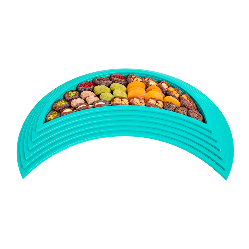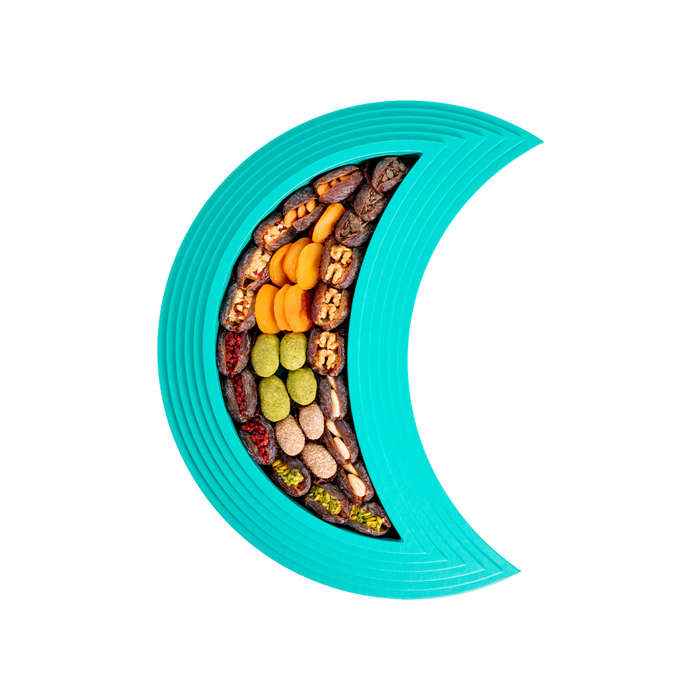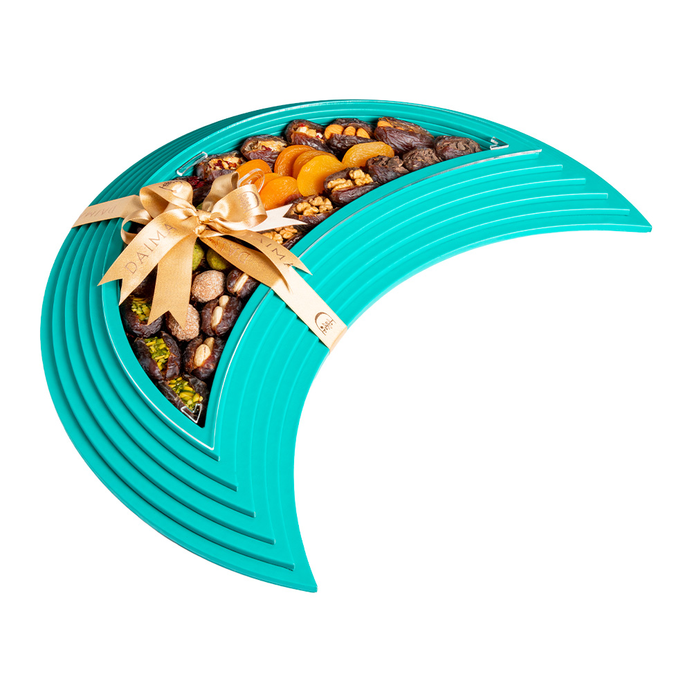 The Medium Leather Half Moon Stuffed Dates Tray Set 960G is a luxurious assortment that celebrates creativity and indulgence. This tray brings together a rich variety of stuffed dates, combining premium nuts, fruit fillings, and chocolate coated selections for a diverse and satisfying experience.