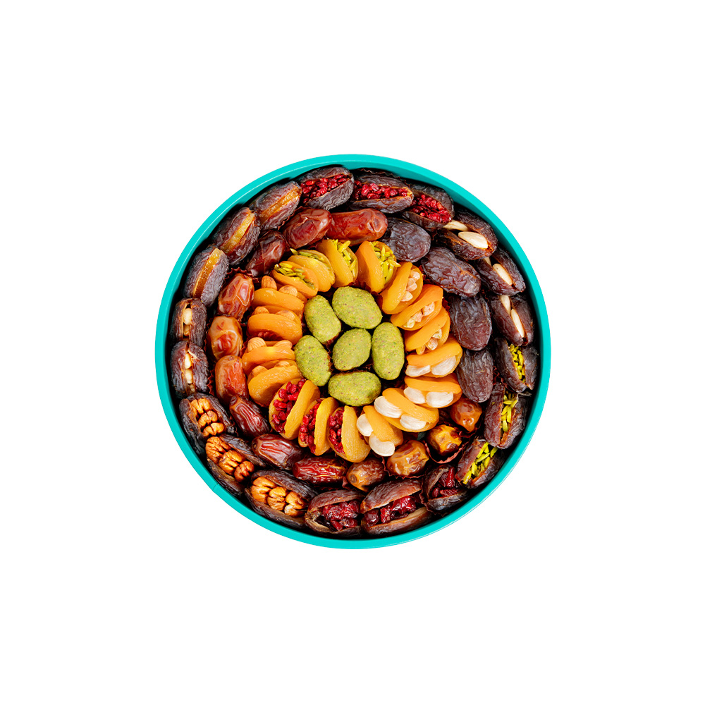 The Medium Leather Round Moon Stuffed Dates Set 1520G is an abundant and refined selection that brings together classic premium dates with an extensive variety of stuffed and flavored creations. From traditional date varieties to indulgent nut filled, fruit filled, and chocolate enhanced options, this set offers a rich and diverse tasting experience.
