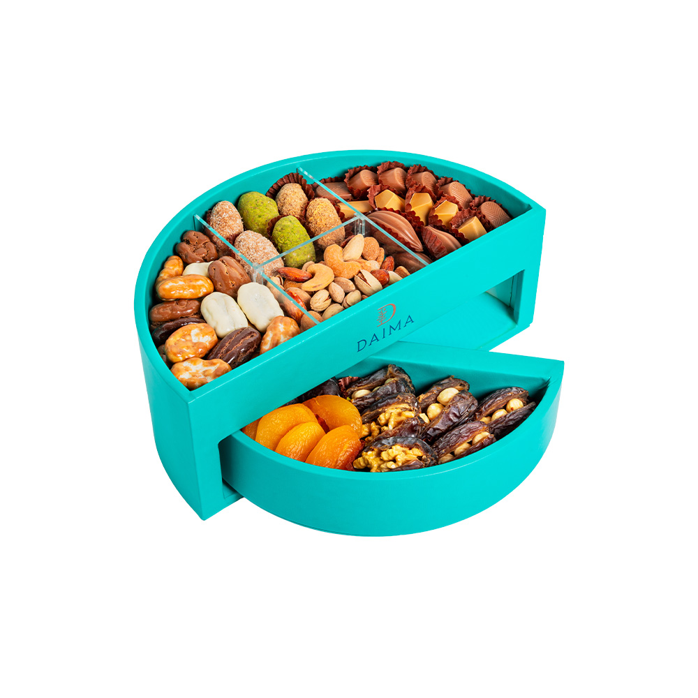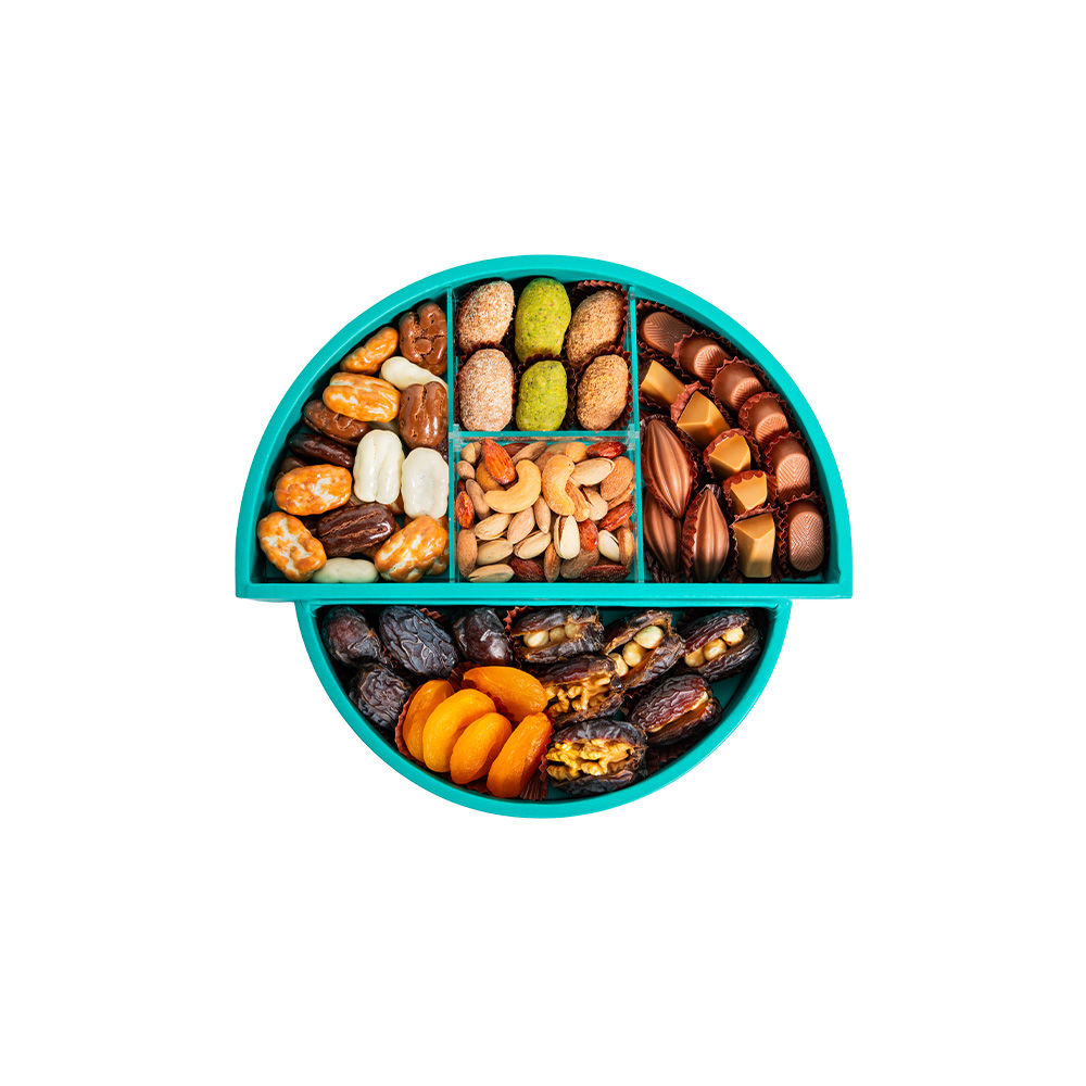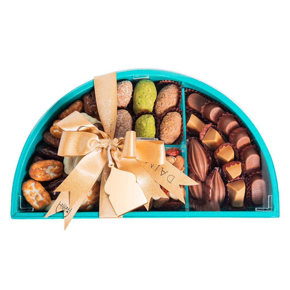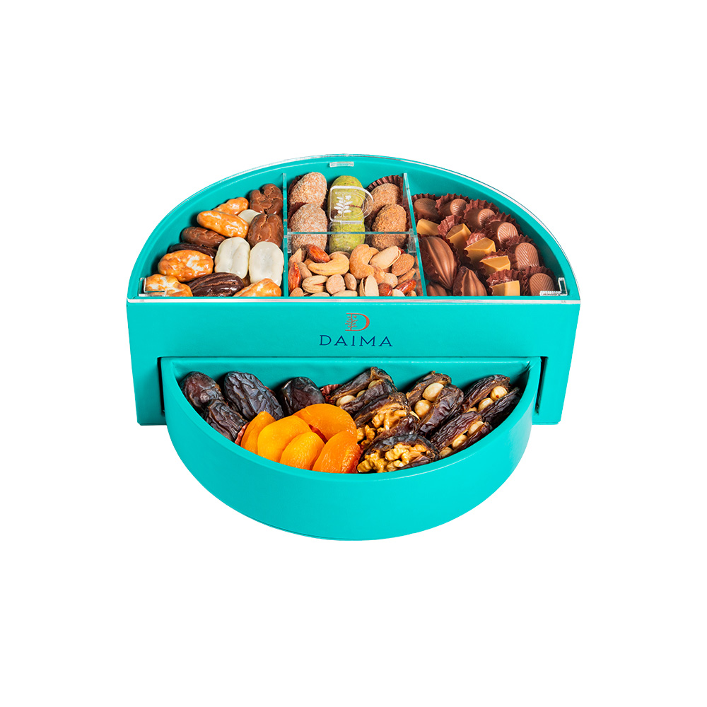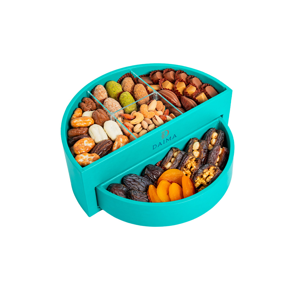 Product DescriptionThe Stuffed Dates Chocolate Circ DB Window Tray Set 926G is a refined assortment that combines premium dates with indulgent chocolate creations and nut based selections. This tray offers a rich variety of flavors and textures, ranging from classic stuffed dates to chocolate coated dates and prali...Reviews0 Back The Stuffed Dates Chocolate Circ DB Window Tray Set 926G is a refined assortment that combines premium dates with indulgent chocolate creations and nut based selections. This tray offers a rich variety of flavors and textures, ranging from classic stuffed dates to chocolate coated dates and praline chocolates, creating a balanced and satisfying tasting experience.Presented in a circular window tray that highlights its elegant contents, this set is ideal for gifting and special occasions. Each selection reflects Daima’s commitment to quality ingredients, thoughtful combinations, and sophisticated presentation. Write a review There are no reviews yet Free Shipping Cash On Delivery Money Back Guarantee 24/7 Support